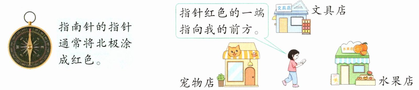 )店。(2)小女孩向后转后,指针红色的一端指向(