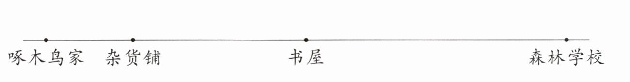 【解析】利用线段图中的位置关系,逐步计算求出啄木鸟从家到森林学校的飞行距离。已知啄木鸟家到书屋有3000米,杂货铺到书屋有2000米,所以啄木鸟家到杂货铺的距离为3000-2000=1000(米)。