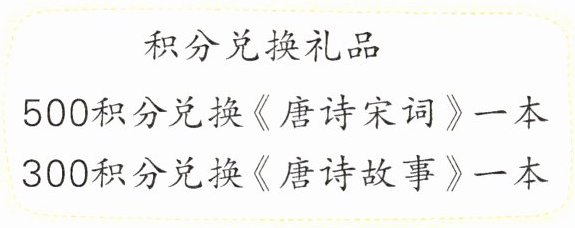 4. 元元参加了“古诗词诵读”打卡活动,她3月获得了138积分,4月获得的积分是3月的2倍。元元3月和4月累计获得的积分能够兑换什么?