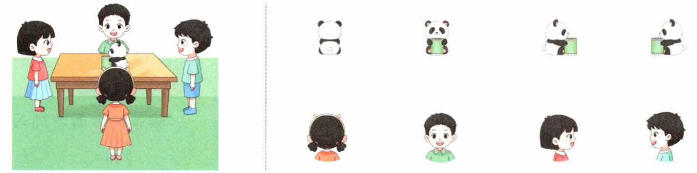 2. 状状用竹子和自己的旧玩偶做了一个笔筒,同学们都来欣赏。下面右边的4幅图分别是谁看到的?连一连。