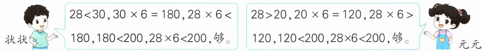 )。(填名字)$28<30$,$30×6= 180$,$28×6<180$,$180<200$,$28×6<200$,够。