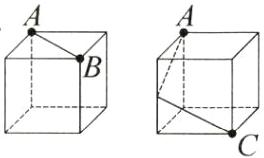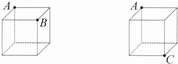 [解析]因为两点间所有连线中线段最短,所以连接点A与点B就能得到A、B之间最短的路线;因为点A与点C不在盒子的同一个面上,所以可以先把盒子的两个面展开(如图),再连接A、C两点就能得到A、C 之间最短的路线,展开的两个面不同,得到的路线也不同。