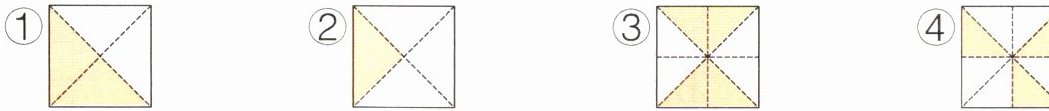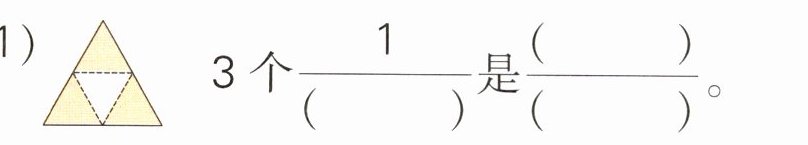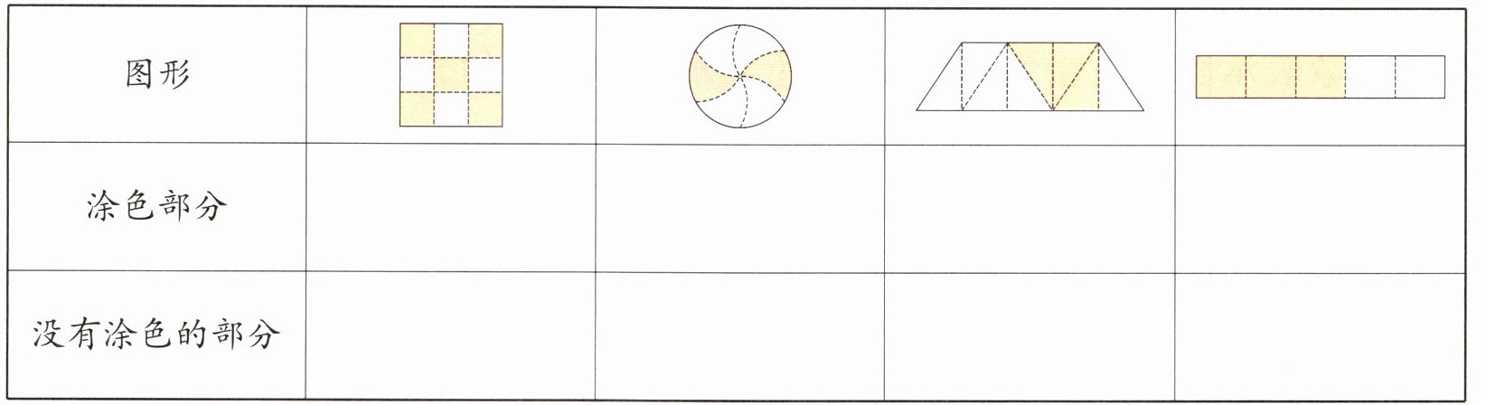 4.$\frac{2}{6}$ $\frac{2}{9}$ $\frac{3}{8}$【解析】可以通过旋转或轴对称的方法,将大小不一的小块拼在一起,最后根据分数的意义填写即可。