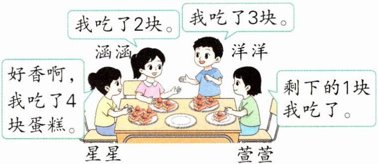 1. 妈妈将宴会上的一个蛋糕平均分成了若干块,4个小朋友分着吃(如图)。