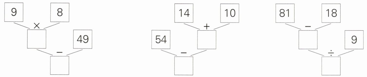 72 23 9×8-49=23 24 30 54-(14+10)=30 63 7 (81-18)÷9=7