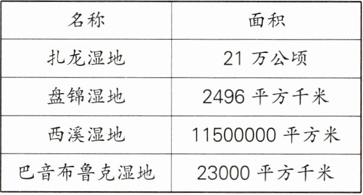 2. 下面是我国几个湿地的面积,按面积从大到小的顺序排列它们的名称。