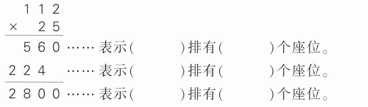 1. 某体育场1号看台有25排,每排有112个座位。这个看台共有多少个座位?根据下面的竖式,在括号里填数。