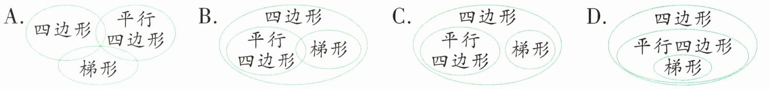 (2) 下面能表示四边形、平行四边形、梯形之间关系的图是( )。
