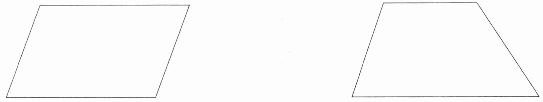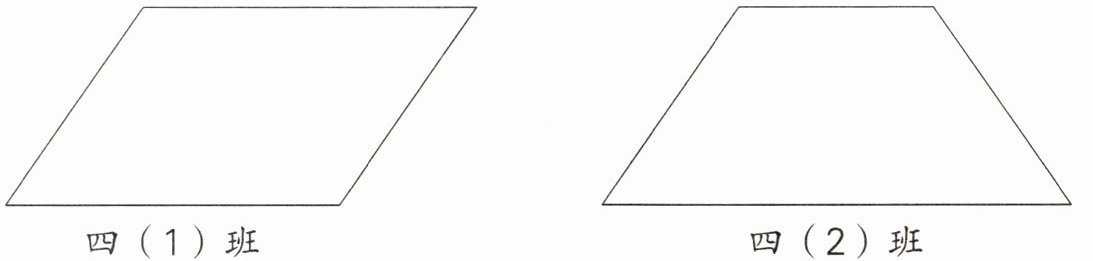 2. 四(1)班和四(2)班分到的空地如下图。四(1)班同学打算把空地分成一个梯形和一个三角形,分别种白菜和土豆;四(2)班同学打算把空地分成一个梯形和一个平行四边形,分别种西红柿和黄瓜。请你帮他们设计出各自的分配方案。