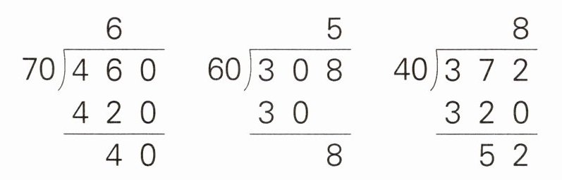 [解析]解题的关键在于灵活运用有余数的除法算式中各部分之间的关系。第1题求除数,根据“除数=(被除数 - 余数)÷商”来计算,即(726 - 6)÷9 = 80;第2题求被除数,根据“被除数=除数×商 + 余数”来计算,即40×6 + 10 = 250;第3题,要使被除数最小,则除数要最小,即除数比余数大1,除数最小是19 + 1 = 20,再求被除数即可;第4题,要使被除数最大,则余数要最大,即余数比除数小1,余数最大是30 - 1 = 29,再求被除数即可。