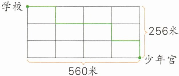 4. 如图,下面是少年宫和学校所在区域的平面图。元元从少年宫出发沿着图中的绿色路线走到学校,前$4分钟走了272$米。照这样的速度,她一共需要多少分钟才能走到学校?