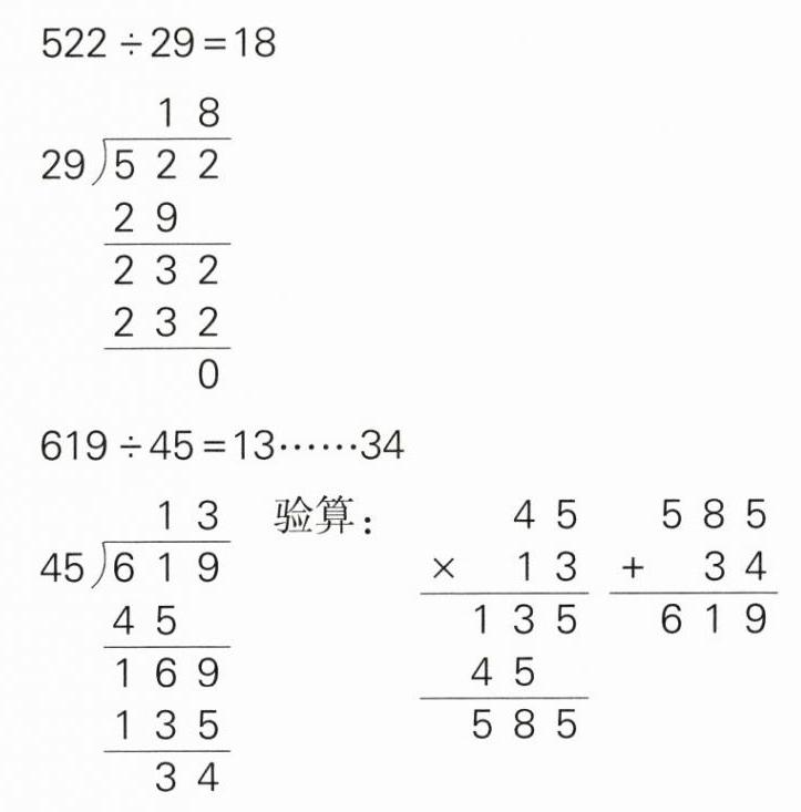 $784÷32= $ $685÷17= $ $522÷29= $ $619÷45= $