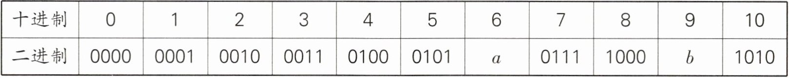 3.0110 1001 【解析】观察表格可知,二进制是"满二进一",5用二进制表示是0101,6用二进制表示就要在0101的最低位上加1,最低位上是2,要向前一位进1,这时最低位就变为0,即a处应填0110;同理可知,b处应填1001。