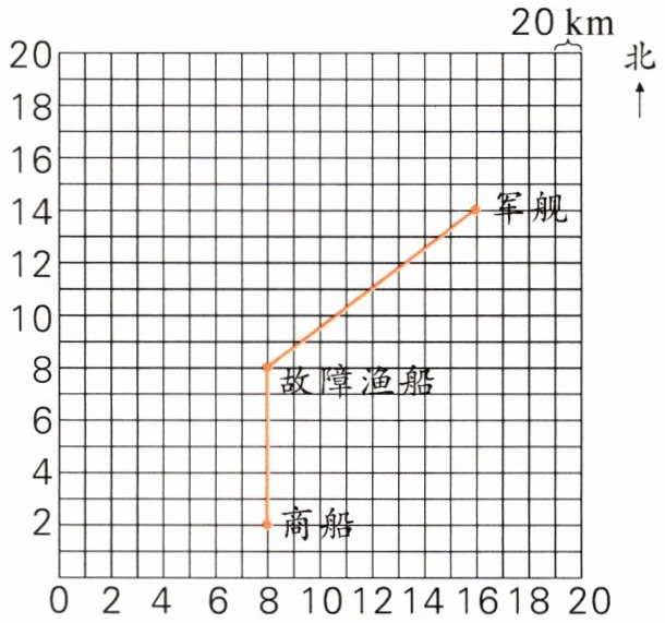 因为每格代表$20$千米,小岛在故障渔船以西$120$千米,$120÷20 = 6$格,再往北$200$千米,$200÷20=10$格。