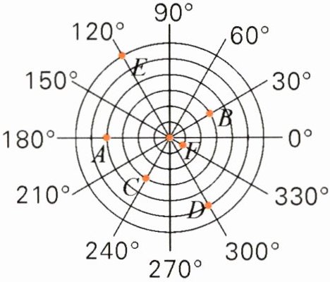 3. 生活中数对还有其他表示形式。下面是雷达探测图,若图中目标$A的位置为(4,180^{\circ })$,$B的位置为(3,30^{\circ })$,请照样子分别表示出目标$C$、$D$、$E$、$F$的位置。