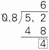 1. (1) 算理题 林叔叔将5.2kg茶叶分装在一些大小相同的盒子里,每个盒子装0.8kg,装完共需要准备几个盒子?元元用竖式计算(如图),虚线框中的“4”表示还剩(