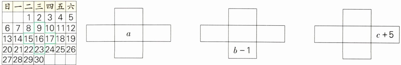 4. 下面是某月的月历,观察框出的五个数,根据你发现的规律用含字母的式子表示其他四个数。
