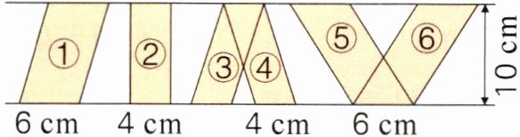 平行四边形⑤、⑥的面积和①相等,平行四边形③、④的面积和②相等。理由:①、⑤、⑥的底都是6cm,高是10cm,②、③、④的底都是4cm,高是10cm。平行四边形的面积=底×高,底和高都相等,面积就相等。