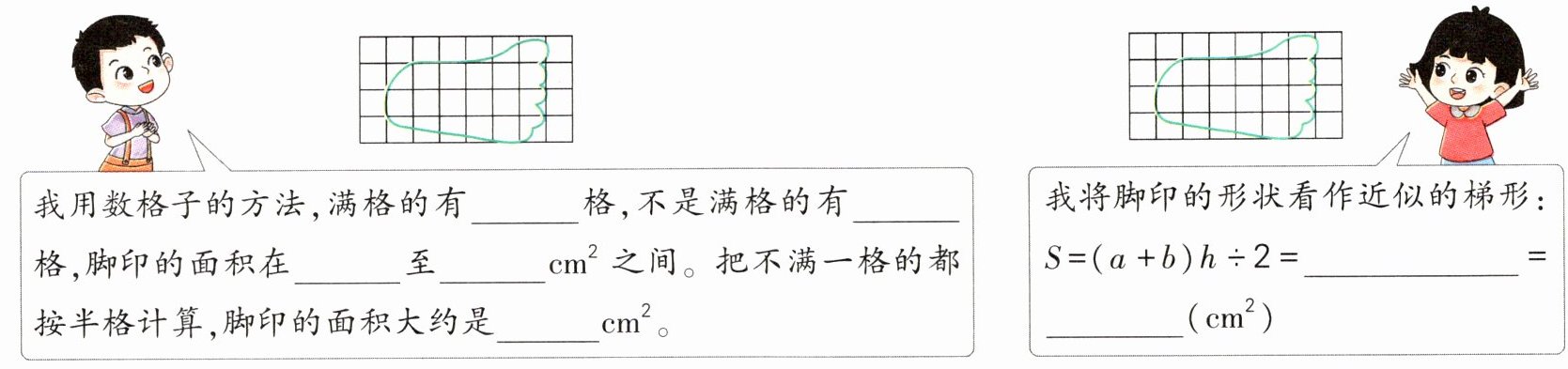 1. 下面是状状出生时的脚印,请你估计脚印的面积。(每个小方格的面积是$1cm^{2}$)