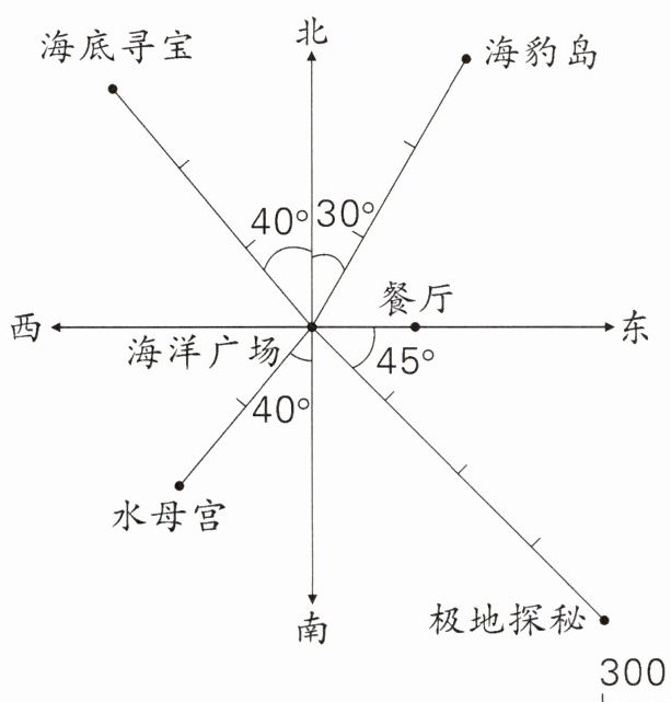 C.餐厅在海洋广场正东方向300m处
