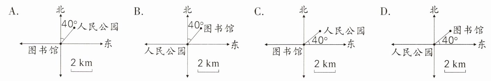 1. 晨跑是锻炼身体的有效方式之一,位于图书馆东偏北$40^{\circ}方向2$km处的人民公园是周围居民晨跑锻炼的好去处。下面图中标注的位置正确的是(