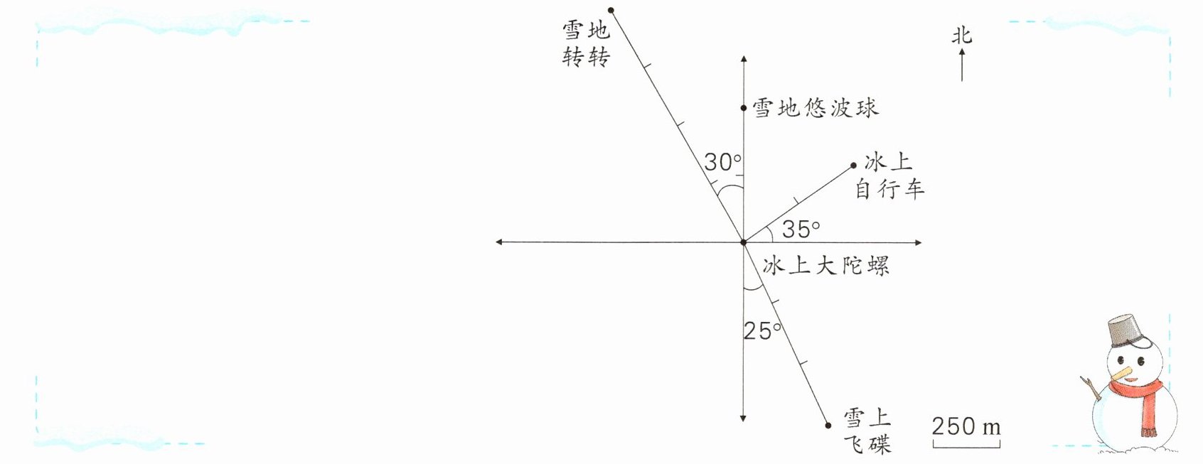 (1) 以冰上大陀螺为观测点,雪地转转在( )偏( )( )°方向上,距离是( )m;雪上飞碟在( )偏( )( )°方向上,距离是( )m;雪地悠波球在( )方向上,距离是( )m;冰上自行车在( )偏( )( )°方向上,距离是( )m。