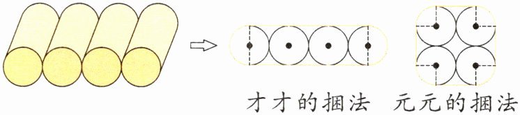 【解析】先求出两种捆法分别所用彩绳的长度,再进行比较。观察才才的捆法,彩绳的长度包含两部分,两段曲线部分可以合成一个整圆,直线部分一共是6条直径的长度,所以所用彩绳的长度=一个圆的周长+6条直径的长度。观察元元的捆法,四段曲线部分也可以合成一个整圆,直线部分一共是4条直径的长度,所以所用彩绳的长度=一个圆的周长+4条直径的长度。