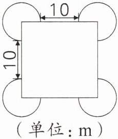9. 下面是一个花台的平面图,每个圆的半径都是 $ 5 \, m $,花台的中间是一个正方形。求这个花台的占地面积。