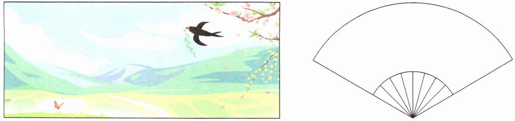 5. (1) 用下面左图这幅画裁剪出右图所示这种折扇的扇面,请你用直尺和圆规画出设计图。