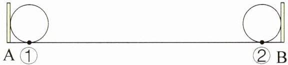 (3) 如图, $ A $、$ B $ 两块挡板之间有一个半径为 $ 3 \, cm $ 的圆,圆从①号位置开始沿直线滚到②号位置,正好滚了 $ 5 $ 圈。那么 $ A $、$ B $ 两块挡板之间的距离是(