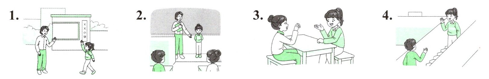七、〔生活情境〕今天是 Chen Meng 来到新学校的第一天,都发生了哪些事情呢?为下列图片选择相符的对话。