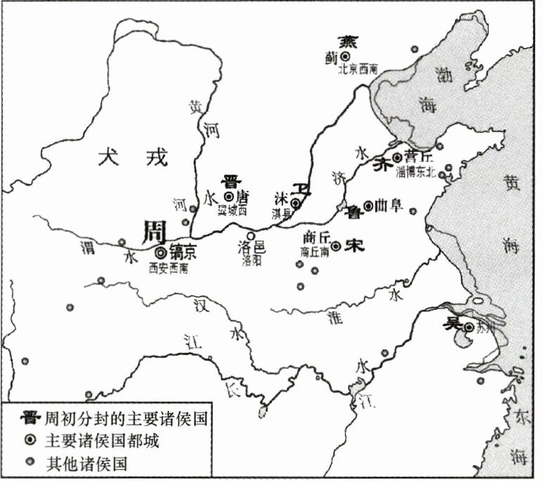 7. 西周初年的整体战略是稳定西北、开发东南。在东进过程中,齐、鲁是前哨,卫国接济东进主力,也北瞰燕翼,东控徐淮(见下图)。这反映出西周统治者(