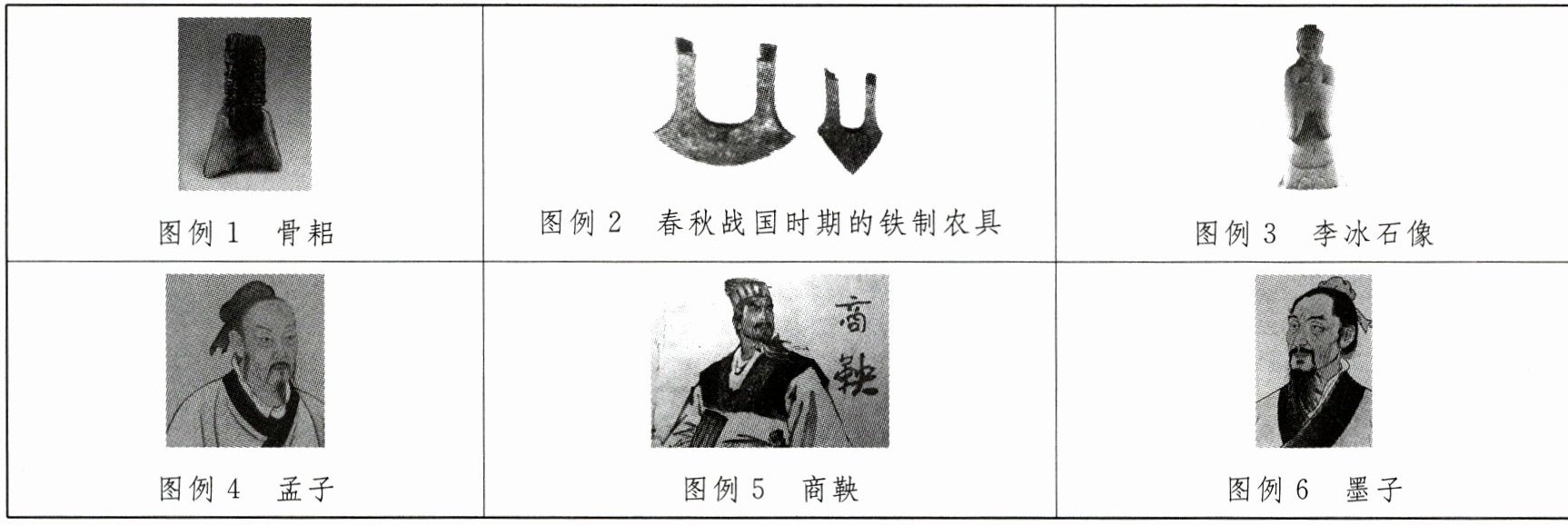 (示例一)图例序号:图例1、图例2。观点:生产工具的革新推动了社会发展。论述:新石器时代的河姆渡人使用骨耜进行农业生产,栽培水稻,原始农业逐步发展。春秋后期,铁制农具出现并在战国时期得到推广,标志着社会生产力水平的提高。同时分封制不断瓦解,称霸兼并战争不断,各国改革此起彼伏,社会形态由奴隶制社会逐步迈入封建社会。结论:生产工具的改进能推动生产力的发展,生产力的发展能带来社会的变革。(10分)(示例二)图例序号:图例3、图例5。观点:杰出人物推动历史发展。论述:商鞅变法使秦国的综合国力大为增强,提高了军队的战斗力,秦国一跃而成为最强盛的诸侯国,为以后秦统一全国奠定了基础。李冰主持修建的都江堰,合多种功效于一个系统,发挥着分洪、灌溉、水运等多方面的作用,使成都平原成为沃野,并在后世一直发挥着巨大的作用。结论:人民群众是历史的创造者,杰出的人物在历史发展潮流中起到了推动作用。(10分)