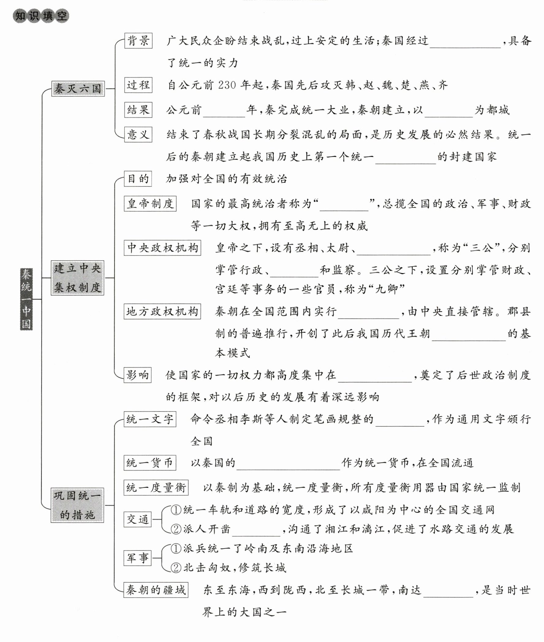 商鞅变法 221 咸阳 多民族 皇帝 御史大夫 军事 郡县制 地方行政 中央政府 小篆 圆形方孔半两钱 灵渠 南海