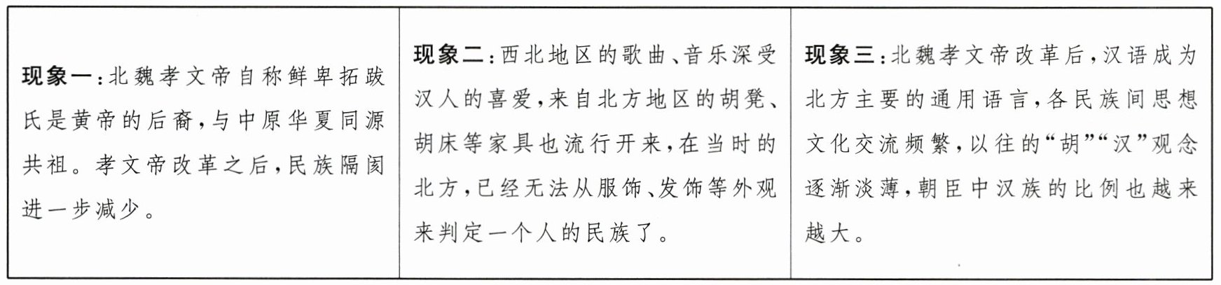 湖北中考题型专练:观点论述题(三)(示例)观点:南北朝时期出现民族大交融。论述:魏晋以来,内迁各族人民与当地汉人错居杂处,过着定居的生活。他们向汉族人民学习农业技艺,生产方式逐渐由原来的畜牧业转变为农业。汉族人民向北方各族人民学习畜牧经验,还接受他们的食物、服装、用具等。北魏孝文帝改革后,汉语成为北方主要的通用语言。北方民族的乐器、歌舞等受到汉族人民的喜爱。尤其是在心理上,随着经济、文化的交流与融汇,各族相互认同感日益加强,以往的“胡”“汉”观念逐渐淡薄。北方地区的民族交往交流交融,为中华民族发展注入新的活力。综上所述,这一时期在总体上,民族隔阂趋于消解,民族关系趋于和缓,我国北方出现了各族的大交融。(10分)