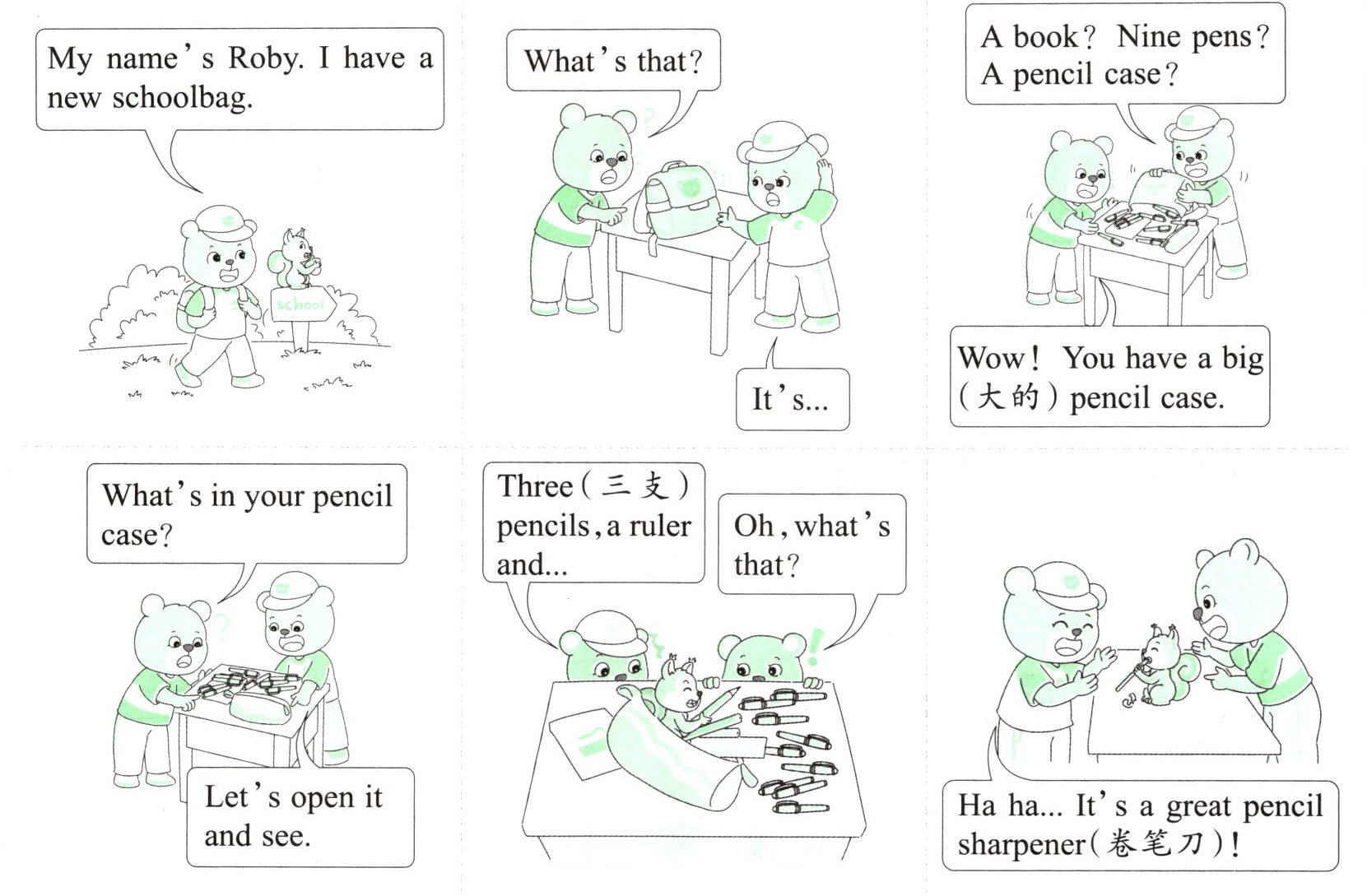 1. B 2. C 3. B 4. B 【解析】由绘本中“Wow! You have a big pencil case.”可知,Roby有一个大的笔袋,故选B项。5. A