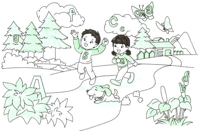 二、你知道下面的图片中藏了哪些字母吗?将它们的大小写形式按字母表顺序写在四线三格中。