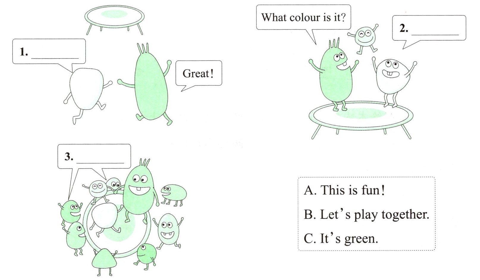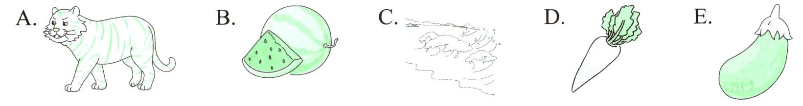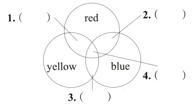 一、〔朝霞原创·新题型〕根据提示词,给下面的三个圆圈涂色,看看有什么神奇的变化。然后,为新出现的颜色选择相应的单词,将序号填入括号内。