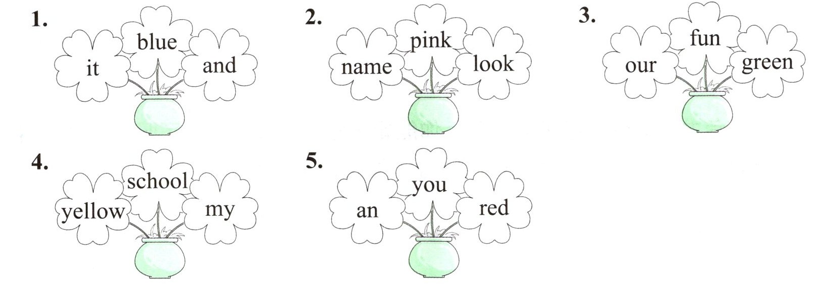 一、Sun Xin 看到卡纸是五颜六色的,她用卡纸制作了手工花。观察每朵花上的内容,圈出表示颜色的单词,并涂上相应的颜色。