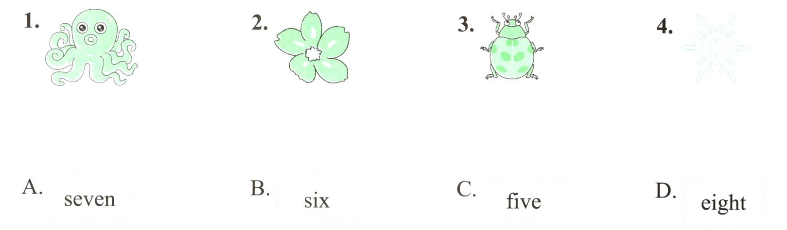 三、1. five 【解析】![img alt=图片编号或题号(图片的具体编号或者所属题目的题号)]图中蛋糕上有五支蜡烛,由此可知,熊猫五岁了,故填 five。2. three 3. two 4. four