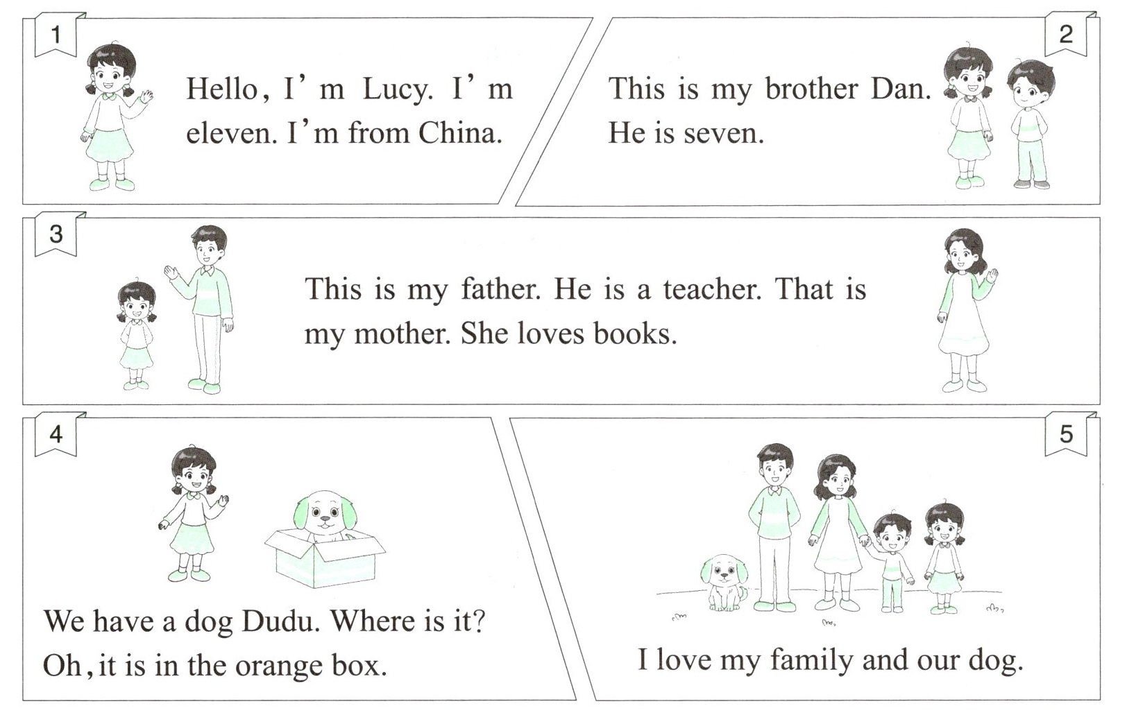 1.T 2.T 3.F 【解析】根据材料中“That is my mother. She loves books.”可知,Lucy的妈妈喜欢书,而不是包,故本题描述错误。4.T 5.F 【解析】材料中“We have a dog Dudu. Where is it? Oh, it is in the orange box.”表明,Dudu在橙色的盒子里,而不是红色的盒子,故本题描述与材料不符。