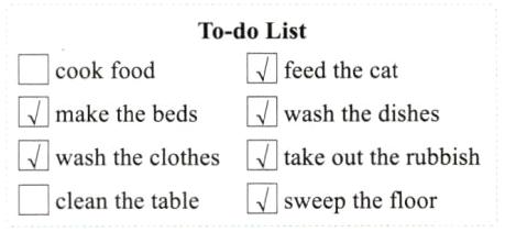 任务一:〔新题型〕奇奇列了一份待办清单。根据短文内容,勾选(√)出奇奇一家将要做的事情。