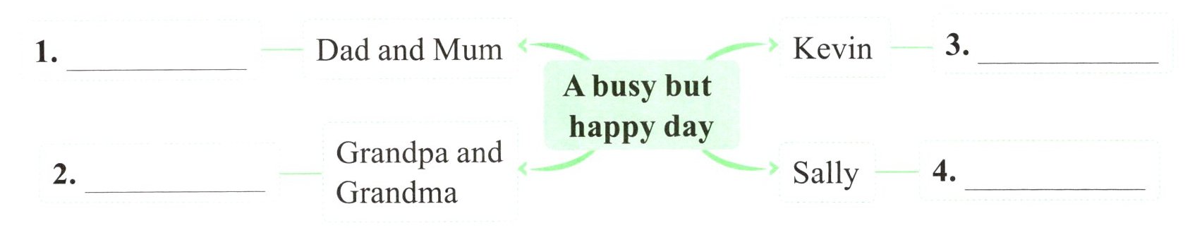 三、〔思维提升〕老师给大家展示了一位同学记录家庭劳动日的作文。阅读作文,补全思维导图。