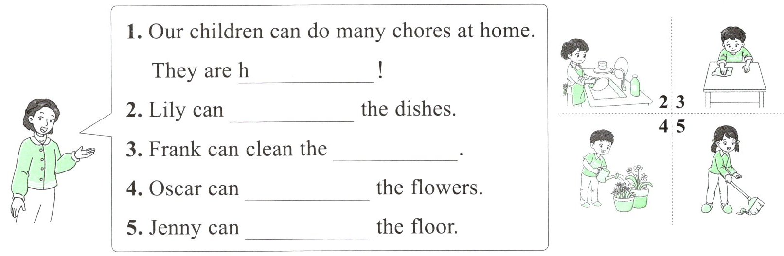1. helpful 2. wash 3. desk 4. water 5. sweep