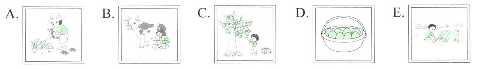 二、老师展示了同学们在农场劳动的照片。为下列句子或对话选择相符的照片。