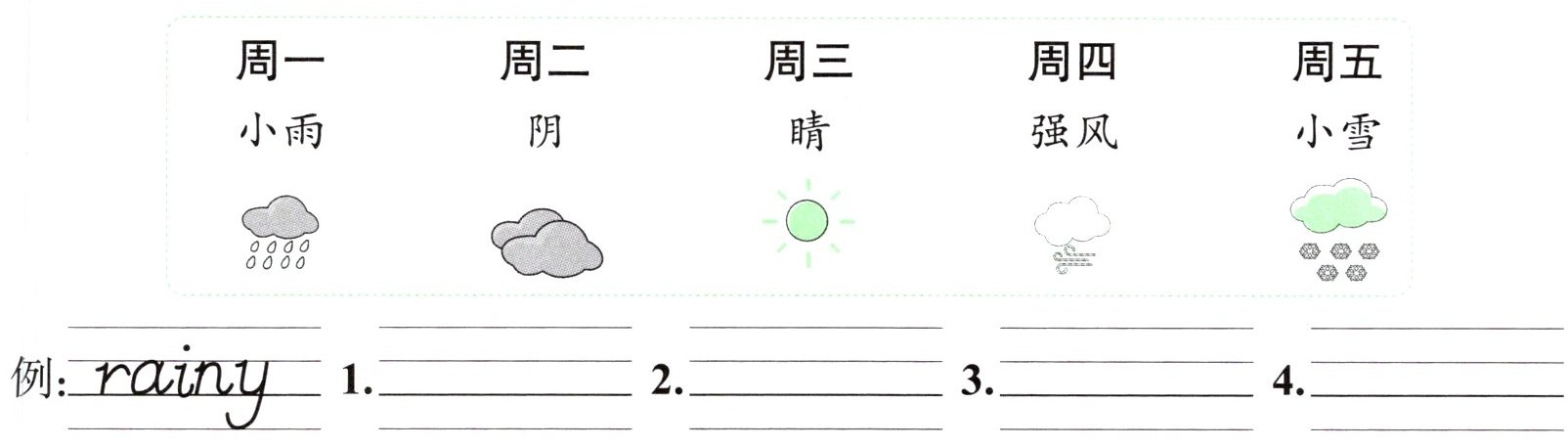 一、[生活情境]Ann 正在查询下周工作日的天气情况。看图,仿照例子在四线三格内依次写出周二至周五的天气情况。