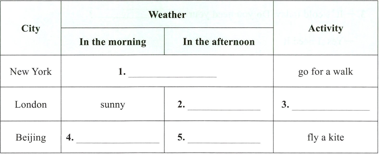 Good morning! This is the weather report for different cities in the world. In New York, it is cloudy and cool all day. You can go for a walk. In London, it is sunny in the morning. But in the afternoon, it is rainy and cool. You can read books at home. In Beijing, it is sunny and hot in the morning. But it is windy in the afternoon. You can fly a kite.