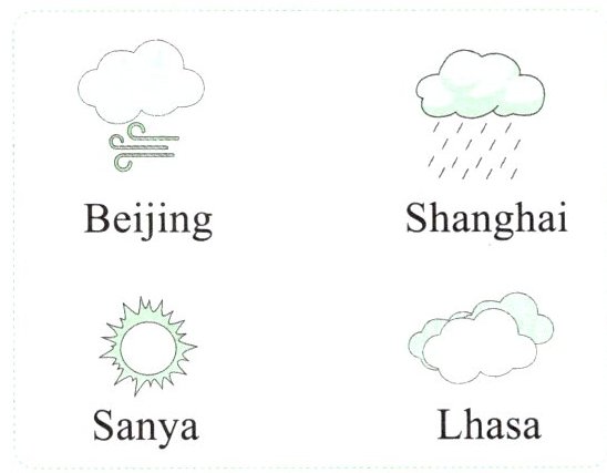 一、Amy收看了天气预报,并记录了各地的天气信息。看图,写出下面四个城市的天气情况。