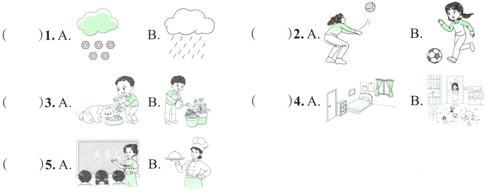 ) 4. It is ______ now. We can ______.A. sunny, go out B. snowy, play with snow C. snowy, stay at home