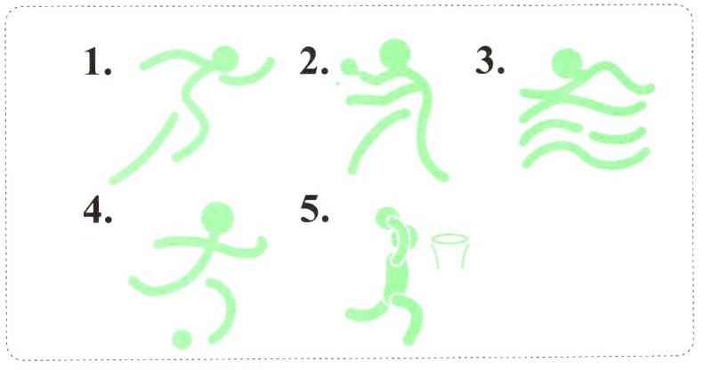 1. run 2. ping-pong 3. swim 4. football 5. basketball